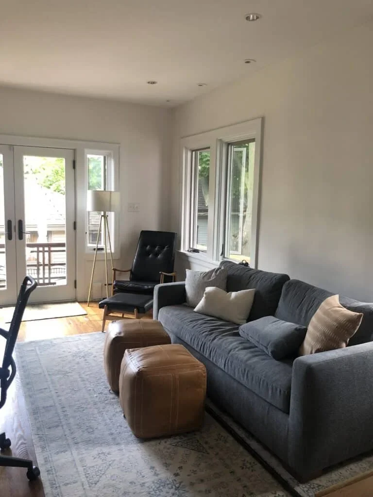 Right (2018): We replaced the windows after living with broken and drafty windows from 1924 for a couple of years. We added a new rug, new pillows and ottomans. This is the half-way point that we maintained for several years before finding out I was pregnant with Sylvie and our family room/office would now also be the guest room.